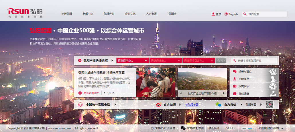 弘阳集团1996年创立于江苏南京,前身为香港红太阳集团,中国驰名商标、中国企业500强、中国服务业500强、中国房地产百强企业。现已形成以商业运营、地产开发、物业服务三大产业协同发展,具有投融资能力的综合性国际企业集团。弘阳集团秉承“构筑城市价值”的运营理念,改善人居环境,提升生活品质,优化城市生活链,促进城市繁荣,致力于成为中国快速城市化进程的重要参与者与推动者。弘阳集团崛起于家居建材行业,凭借前瞻性的战略眼光,以商业运营、地产开发、物业服务三大中心业务模块,全面实现企业产业结构升级。截至目前,弘阳集团现已在江苏南京、南通、苏州、无锡、常州等地开发建设了30余个以“弘阳”冠名的商业和地产项目,累计开发项目体量1000万平方米,具备国家房地产开发一级资质、国家一级物业服务资质。